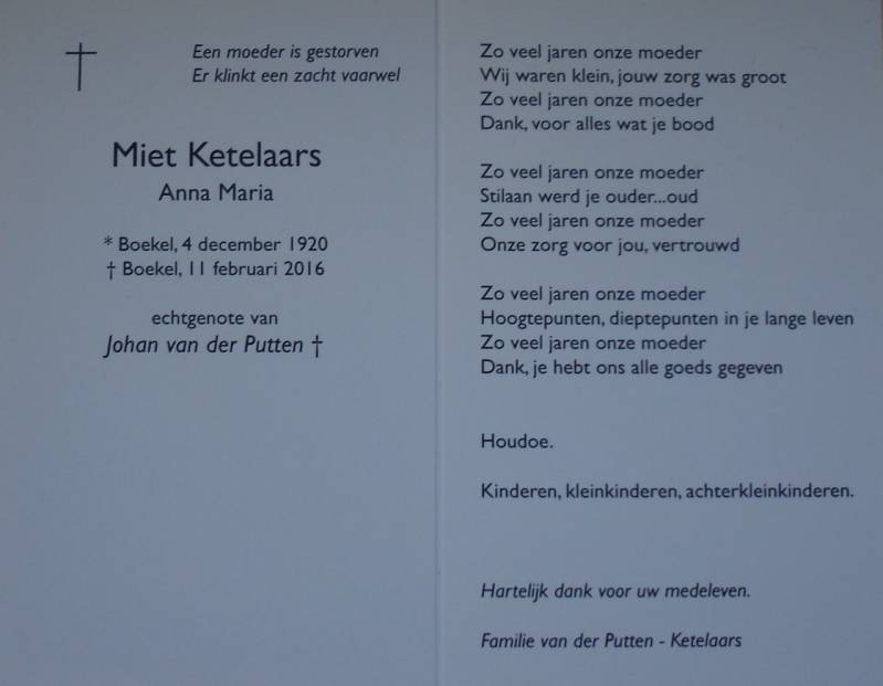 De moeder van Anke is Miet (Maria ) Ketelaars. Zij werd vlak voor Sinterklaas, op 4 december 1918, geboren in Boekel. Ze werkte op de boerderij van haar ouders tot ze na de Tweede Wereldoorlog op 4 juni 1946 trouwde met Johan van der Putten, die daarvoor nog melkboer was en regelmatig langs kwam. Ze gingen in verband met de woningnood wonen in een "hennenkooi" en pas na de geboorte van Mia, Nellie en Anke verhuisden ze naar de nieuw gebouwde boerderij op de "Diepertse weg bij Cleefswit. Het was een gemengd bedrijfje. Hier werd Francien geboren en later Hans, die op elfjarige leeftijd op zijn fiets door een auto werd aangereden en overleed. In 1978 verhuisden ze naar Handel zelf. Na de dood van Johan heeft Miet nog twaalf jaar in het huis op de Boskant gewoond tot ze het laatste jaar voor haar dood naar het verzorgingshuis Sint Petrus in Boekel moest vanwege haar dementie. Ze overleed op 95-jarige leeftijd.